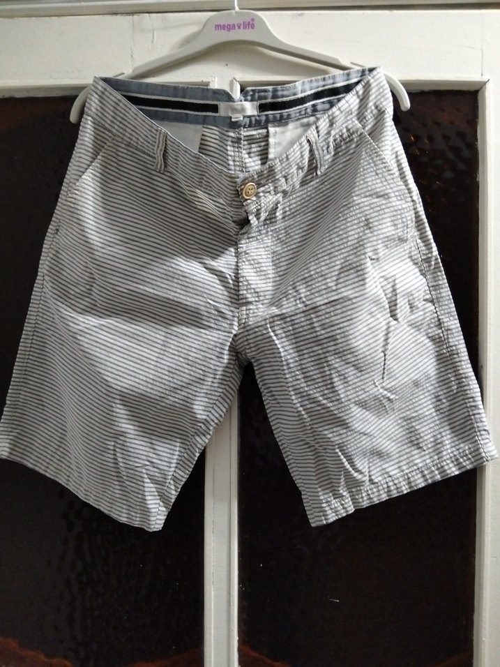 Pamuk kumaştan, beyaz ve gri zebra desenli, kemerli ve regular fit erkek kısa şort. Günlük rahat sokak stili için uygundur.