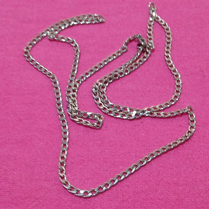 Gümüş renk zincir kolye, canlı pembe zemin üzerinde. Renkli ve gösterişli tarzıyla öne çıkan, avant-garde modayı yansıtan bir aksesuar. ✨65 cm 2.5 mm
