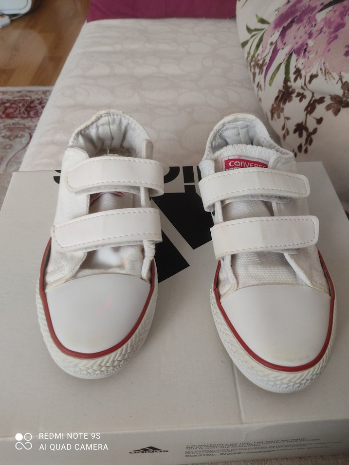 Beyaz kız çocuk spor ayakkabısı, velcro bantlı ve kauçuk tabanlı, sade ve deseniz sokak tarzı. Rahat ve kullanımı kolay.