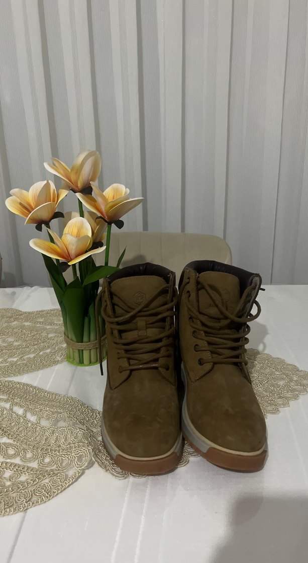 Kahverengi süet kadın botları, dolgu topuklu ve bağcıklı tasarıma sahip, çiçek desenli rahat bir modeldir. Trendy gündelik kullanım için uygundur.
