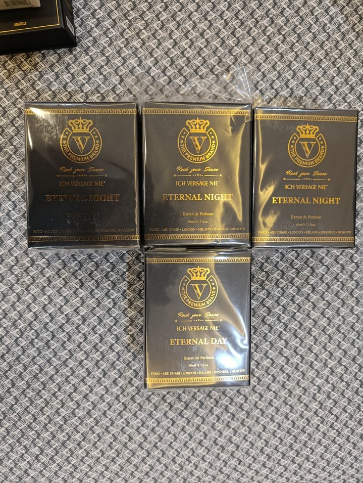 Erkekler için koyu altın renkli, vintage tarzda klasik tasarımlı parfüm seti. 'Eternal Night' ve 'Eternal Day' kokularını içerir, zamansız bir şıklık