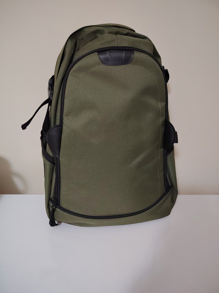 Erkekler için koyu haki kamuflaj desenli, fermuarlı bölmeleri olan minimalist tarzda sırt çantası.