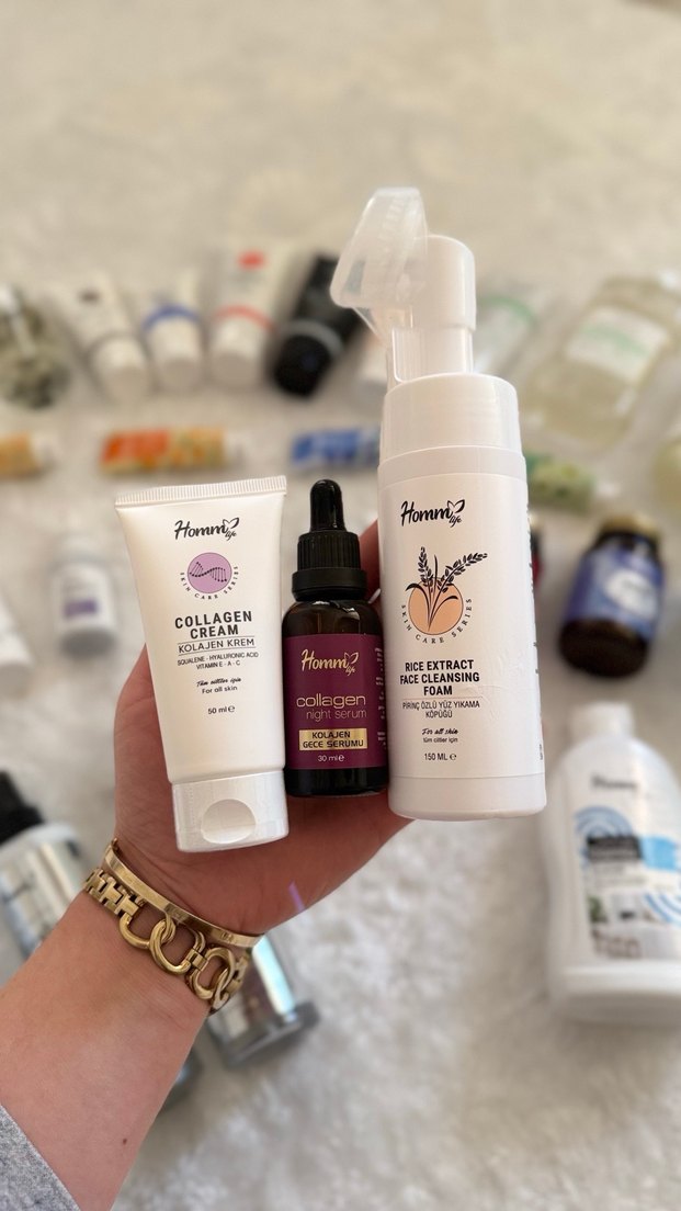 Bu erkekler için cilt bakım seti, kolajen krem, gece serumu ve pirinç özlü yüz temizleme köpüğü içerir, cildi besler ve temizler.