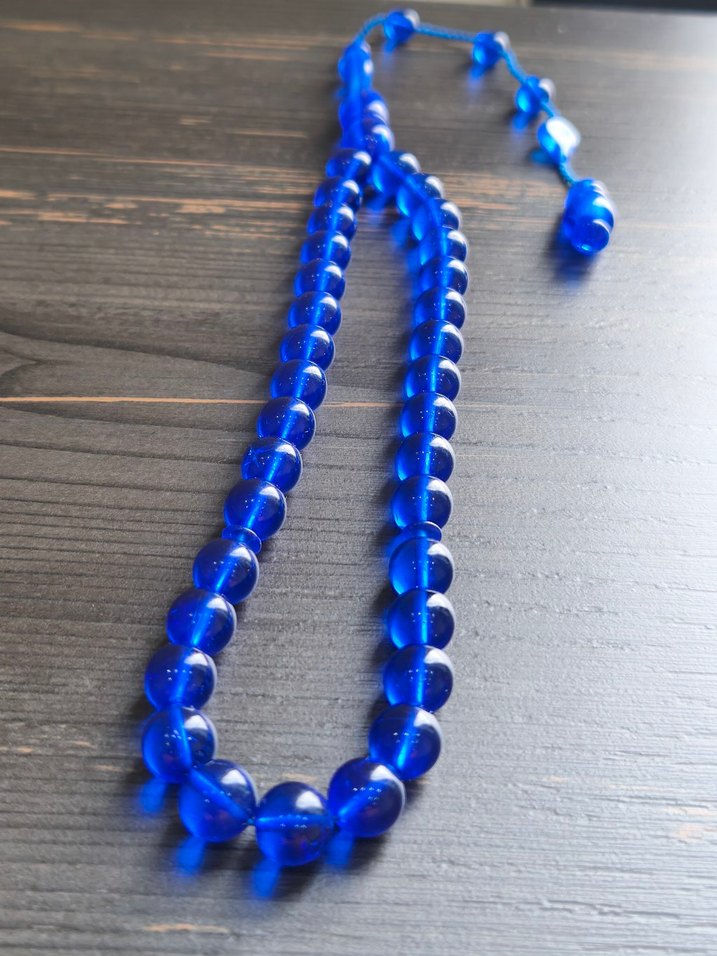 Erkekler için canlı mavi renkte, konvansiyonel tasarımlı ve minimalist tarzda tesbih. Düzgün şekilli ve rahat kullanımlı boncuklardan oluşur.