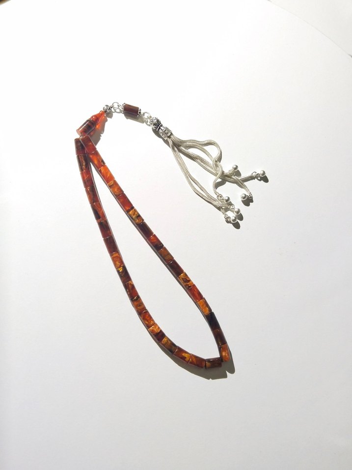 Çok sıkma kehribar boncuklar ve gümüş 925 ayar püsküllerle bohem tarzda geleneksel erkek tesbihi. Özel deri kutusunde