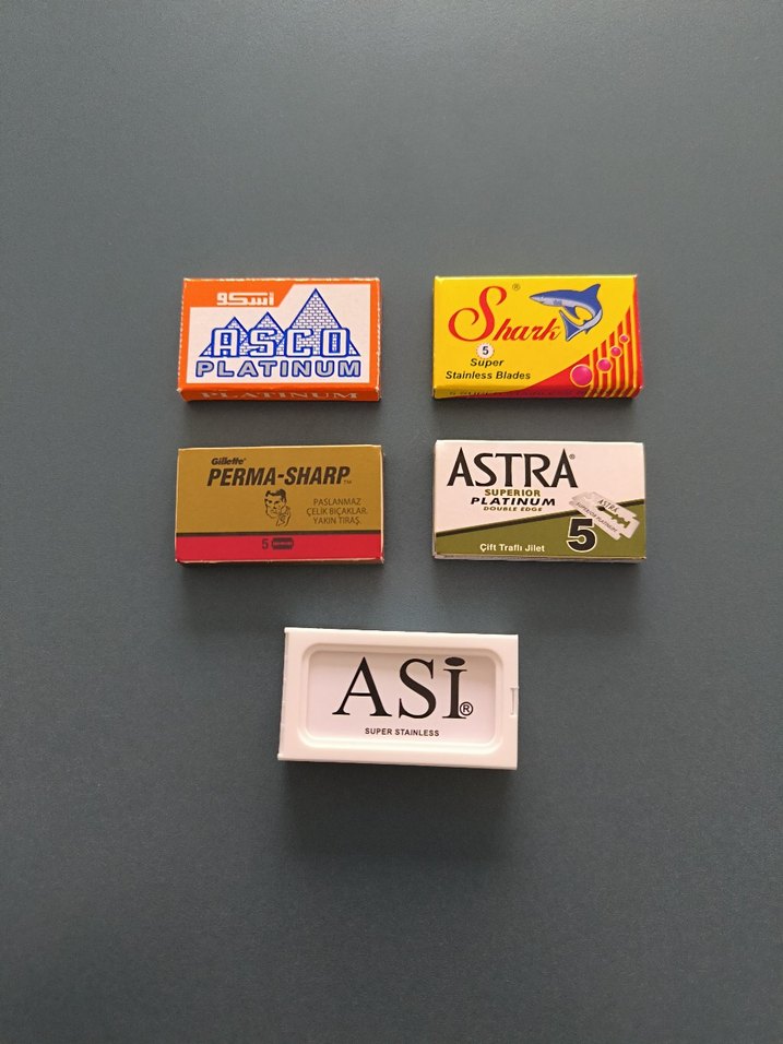 Erkekler için Astra, Perma-Sharp, Platinum, Asco ve ASi markalı renkli tıraş bıçakları ve yedekleri.