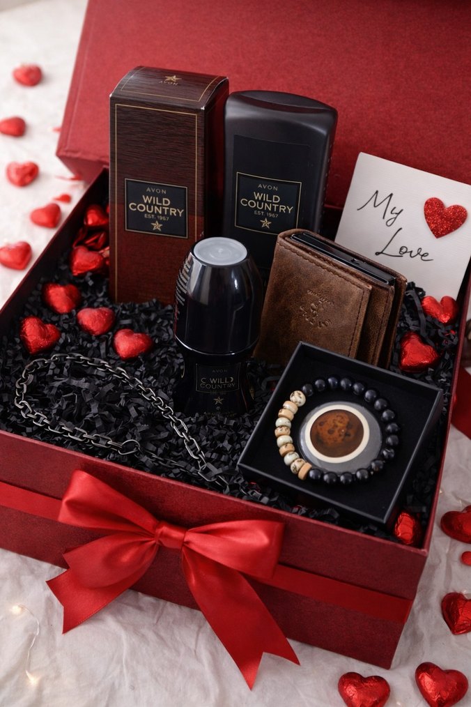 Avon Wild Country erkek parfümü, kahverengi deri cüzdan, siyah boncuklu bileklik ve zincir çelik bileklik içeren, bordo hediye kutusunda bohem ve sıcak tarzda set. ❤️