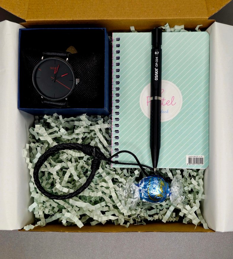 Bu sette siyah saat, renkli boncuklu bağlama desenli plastik bileklik, siyah kalem ve spiralli defter bulunur. Bileklik canlı renklere sahiptir.