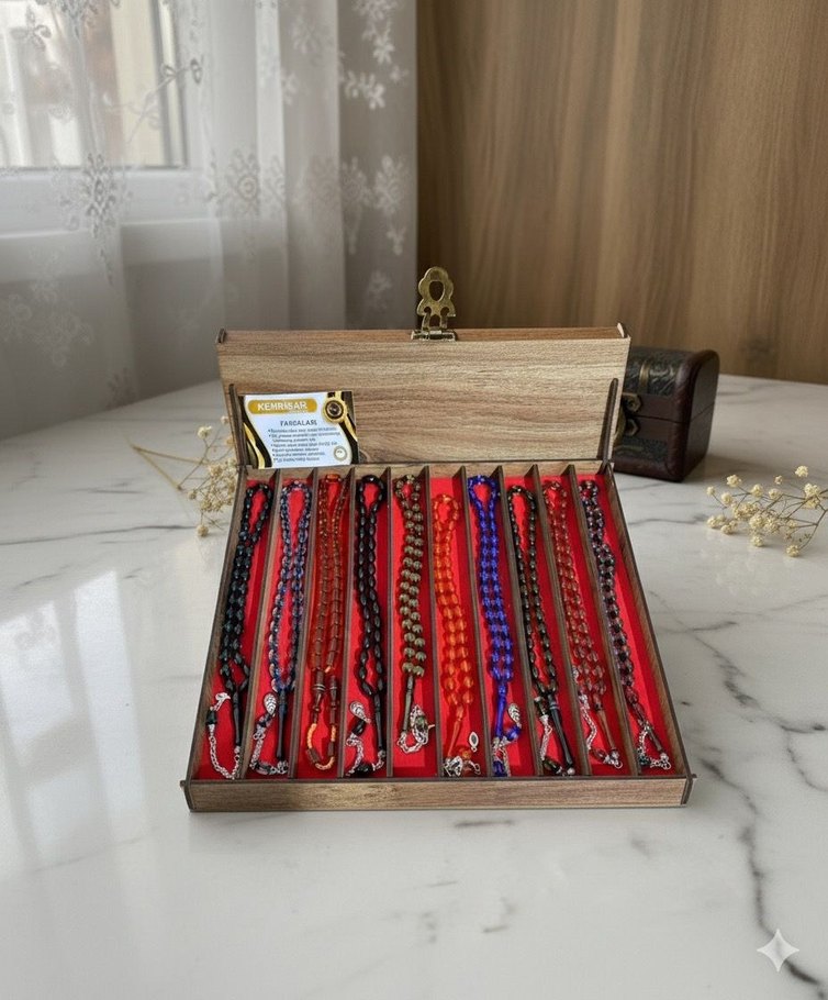 10 lu set fiyat 1750 tl Vintage tarzda çok renkli erkek tesbih seti, koyu tonlarda ve klasik tasarımlarla ahşap kutuda sunuluyor.