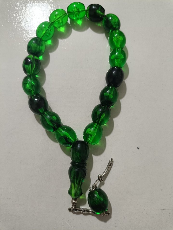 Renkli yeşil tanelerden oluşan, minimalist ve karşı kültür tarzında erkek tesbihi. Boncuklar pürüzsüz ve şeffaf, gümüş tonlu püskül ile bağlanmıştır.