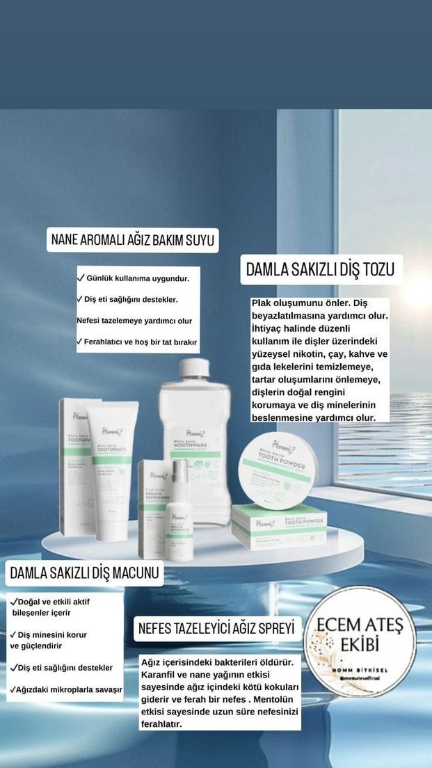 Nane aromalı ağız bakım suyu, damla sakızlı diş macunu, diş tozu ve nefes tazeleyici sprey içerir. Plak oluşumunu önler, diş minesini korur, doğal rengini destekler ve nefesi tazeler.