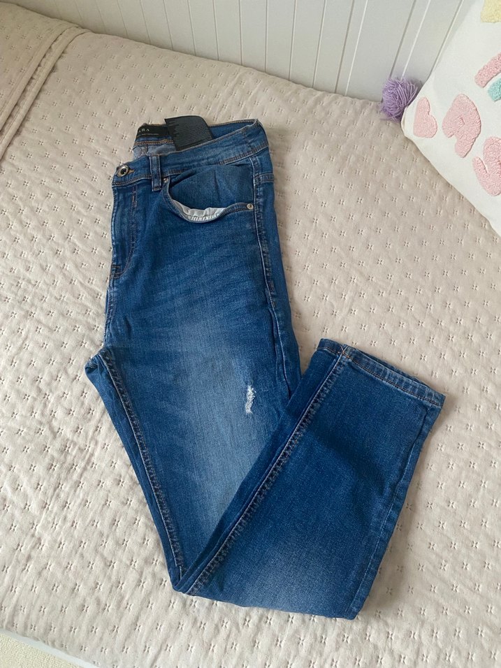 Erkekler için mavi denimden, normal kesim ve tokalı detaylı jean. Normcore tarzda, midi boyda ve desensiz, günlük kullanıma uygun.