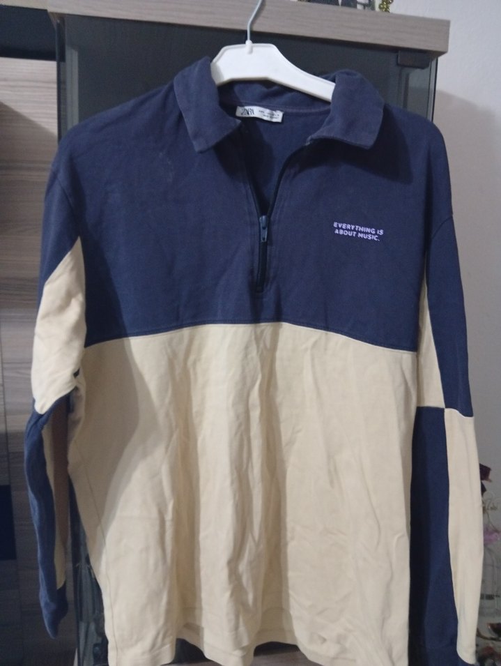Erkek sweatshirt, uzun kollu, yakalı ve fermuarlı. Gevşek kesim, mavi-bej pastel renk bloklu, yumuşak kumaştan. Rahat ve günlük kullanıma uygun.