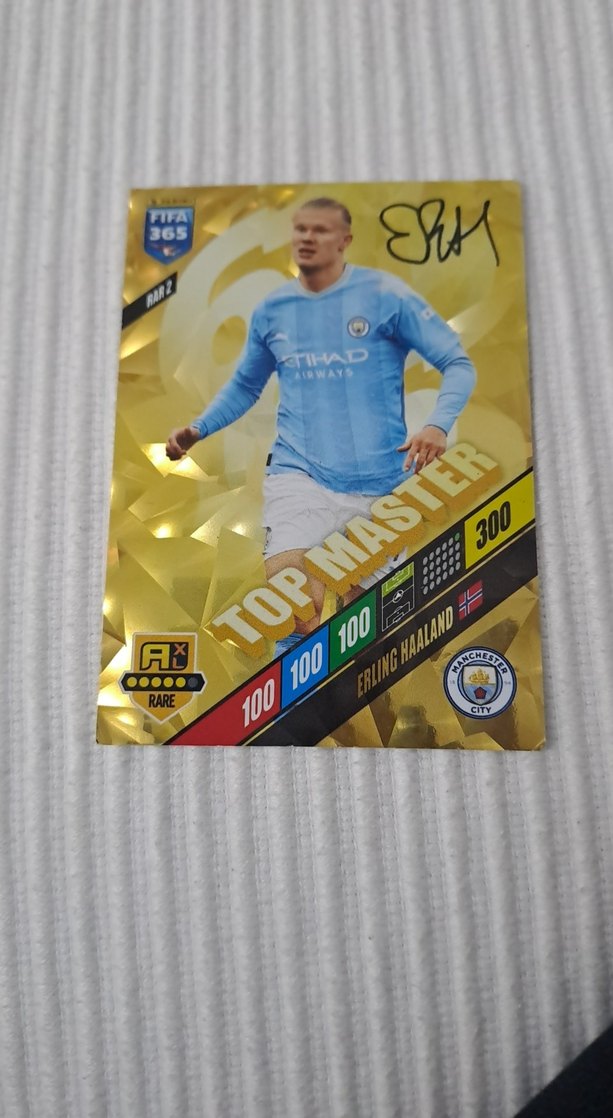 Erling Haaland görselli, parlak altın pop kültür rozeti. İmza ve istatistikler içerir. Athleisure tarzında trend belirleyici. ⚽️