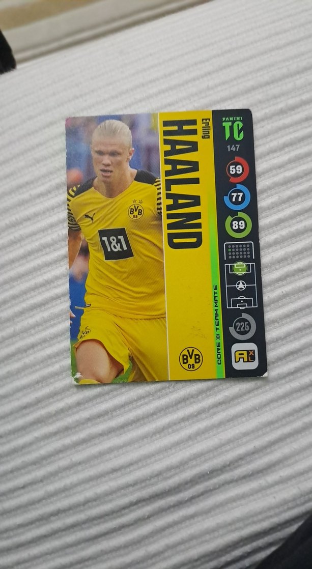 Erling Haaland görselli koyu sarı erkek rozet, Borussia Dortmund forması ve istatistiklerle. Üzerinde 'HAALAND' ve '1&1' yazısı bulunur. ⚽