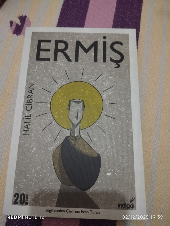 Halil Cibran'ın "Ermiş" adlı kitabı, soyut figür ve sarı daireli sade kapak tasarımıyla. İngilizceden çeviren Eren Turan.