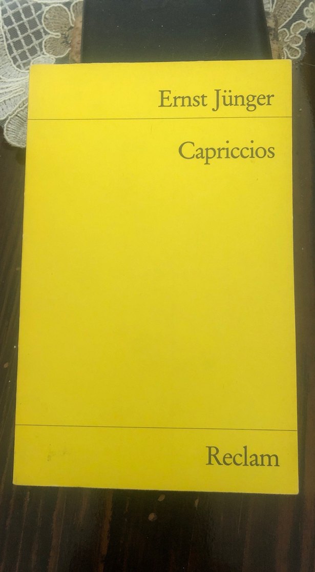 Ernst Jünger'in 'Capriccios' adlı şiir kitabı, Reclam yayınevi tarafından basılmış. Sarı kapak ve siyah yazılı sade tasarım. 1953 baskısı Almanca cep boy raf no A2