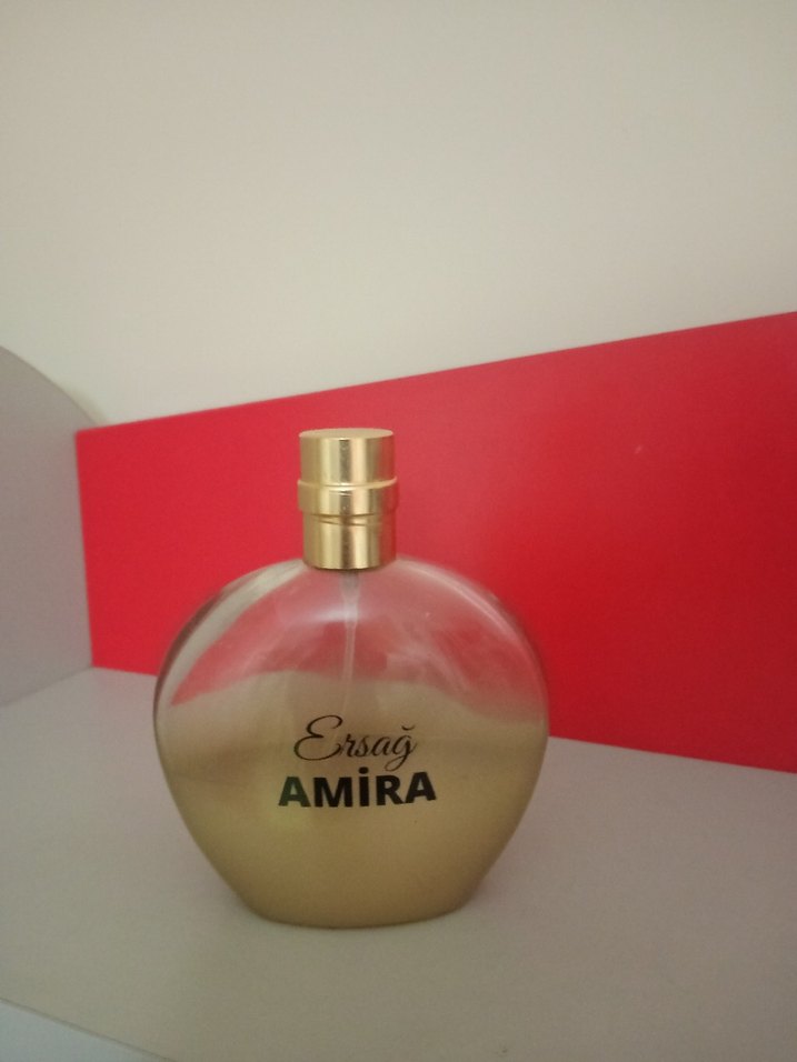 Altın tonlu şişede Ersağ Amira kadın parfümü, zarif bir koku deneyimi sunar kapağı kolay açılıyor başka bir sorunu yoktur