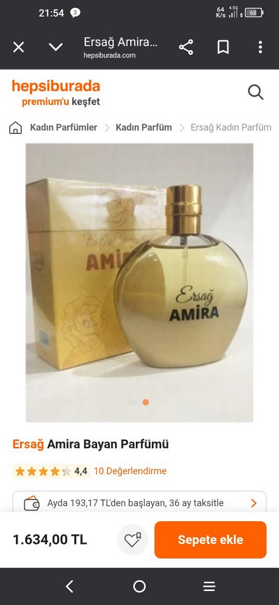 Ersağ Amira kadın parfümü, yuvarlak şişede altın kapaklı ve yumuşak çiçeksi kokuya sahip. Popüler bir koku seçeneğidir. kapagı yok sadece
