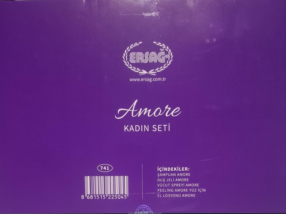 Ersag Amore kadın seti; şampuan, duş jeli, vücut spreyi, yüz için peeling ve el losyonu içerir. Kişisel bakım için eksiksiz set.