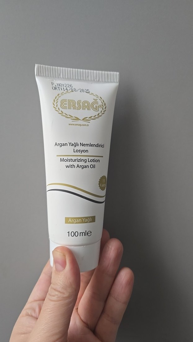 ERSAG argan yağlı nemlendirici losyon, 100 ml tüpte cildi nemlendirir ve besler. Günlük cilt bakımı için uygundur.