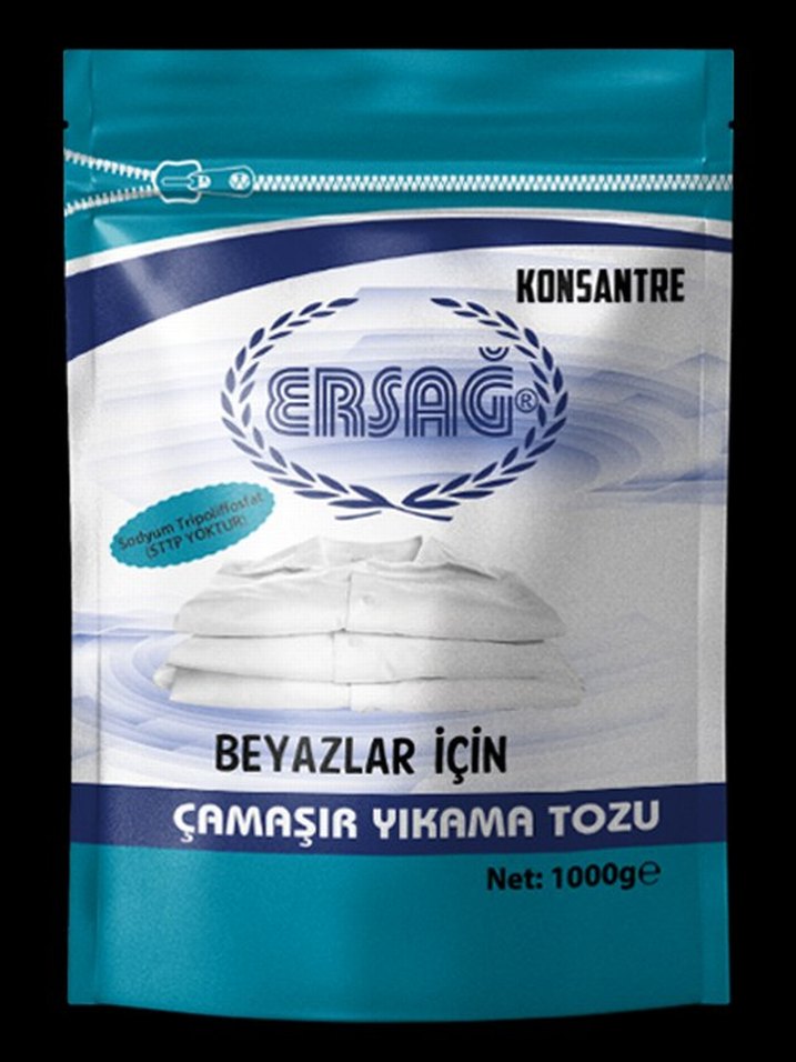 Ersag markasına ait beyazlar için konsantre çamaşır yıkama tozu, 1000 gram ağırlığında, beyaz çamaşırlarda kullanılır.