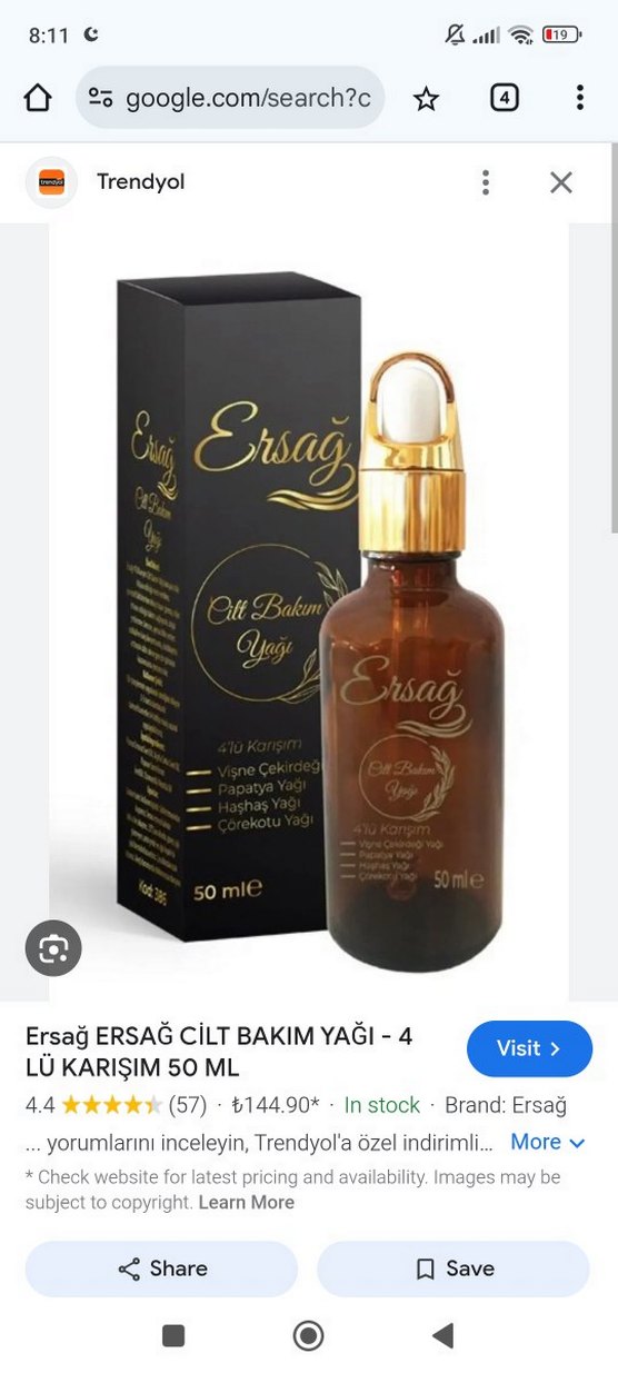 Ersağ cilt bakım yağı, vişne çekirdeği, çörekotu, haşhaş ve papatya yağlarından oluşan 50 ml'lik karışım içerir. 3 defa kullandım çok az şekilde kokusu bana ağır geldiği için satıyorum ürün gayet iyi nemlendiriyor. Hiçbir sıkıntısı yok.