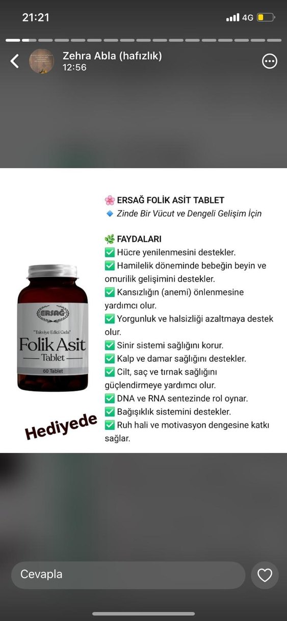 Ersağ Folik Asit Tablet, hücre yenilenmesini destekler, hamilelikte beyin ve omurilik gelişimini sağlar, kansızlığı önler, yorgunluğu azaltır. Sinir sistemi, kalp-damar sağlığını korur, cilt-saç-tırnakları güçlendirir, bağışıklığı destekler ve ruh haline katkı sağlar.