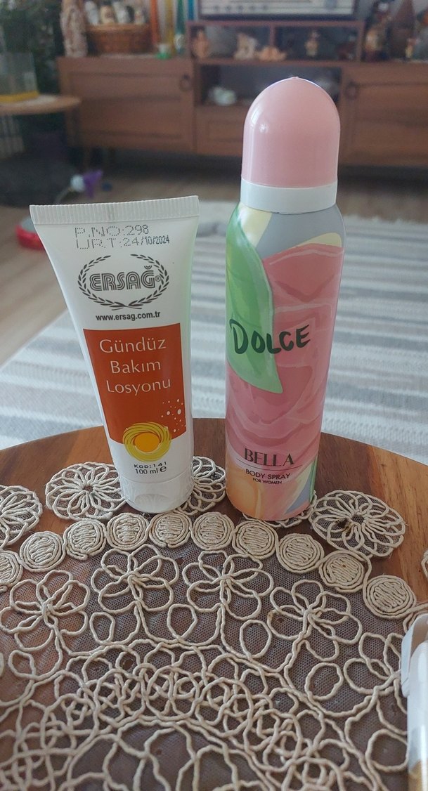 ERSAG Gündüz Bakım Losyonu cilde günlük bakım sağlar. DOLCE Bella vücut spreyi hoş ve ferah bir koku sunar. ikiside hiç kullanılmadı.toplu satıştır ikisinin fiyatıdır.