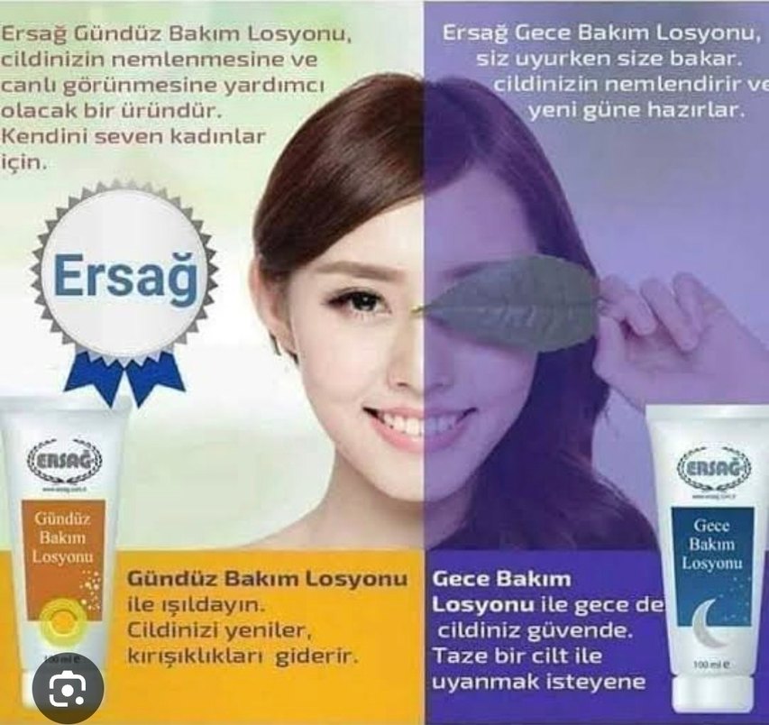 Ersağ gündüz ve gece bakım losyonları, cildinizi yeniler, kırışıklıkları giderir ve gece uyurken cildinizi güvende tutar.