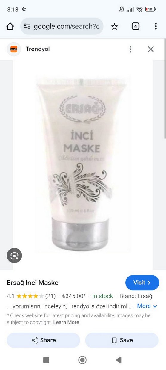 Ersag İnci Maske, cildi temizleyip canlandırmaya yardımcı inci özlü yüz maskesidir. 150 ml tüpte, gümüş kapaklıdır. 3 4 feda en fazla kullandım yeni üründür. Çok fazla cilt bakım ürünüm olduğu için satıyorum. Hiçbir sıkıntısı yok.