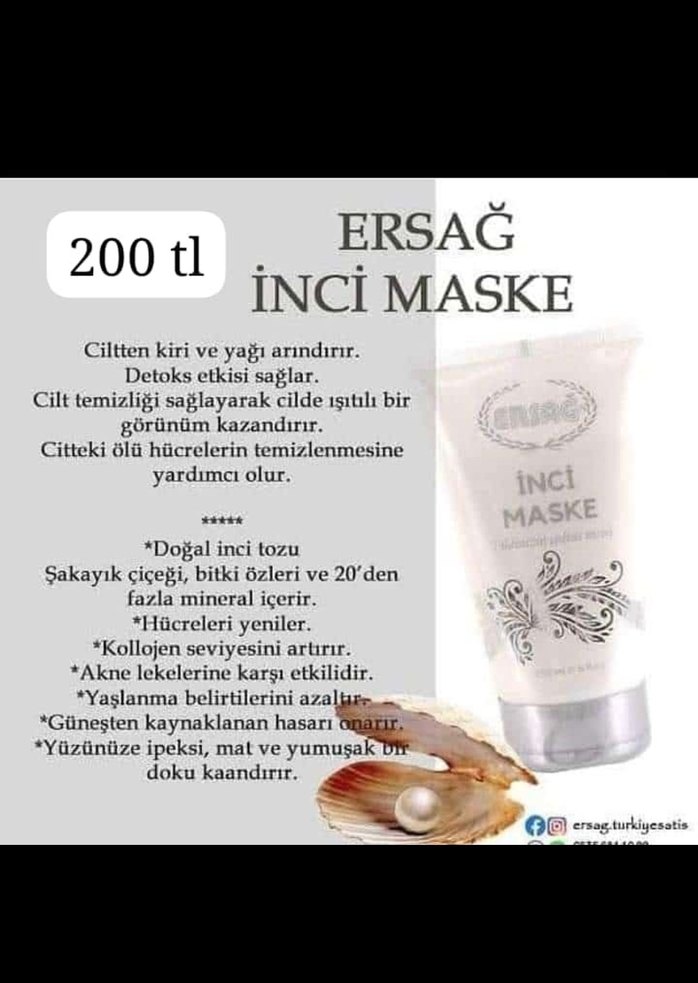 Ersağ İnci Maske, ciltteki kir ve yağı arındırır, detoks etkisi sağlar. Doğal inci tozu, şakayık çiçeği ve 20'den fazla bitki özü içerir. Hücreleri yeniler, kolajen seviyesini artırır, akne lekelerine ve yaşlanma belirtilerine karşı etkilidir. Güneş hasarını onarır, cilde ipeksi, mat ve yumuşak bir doku kazandırır. #ERSAĞ İNCİ MASKE
