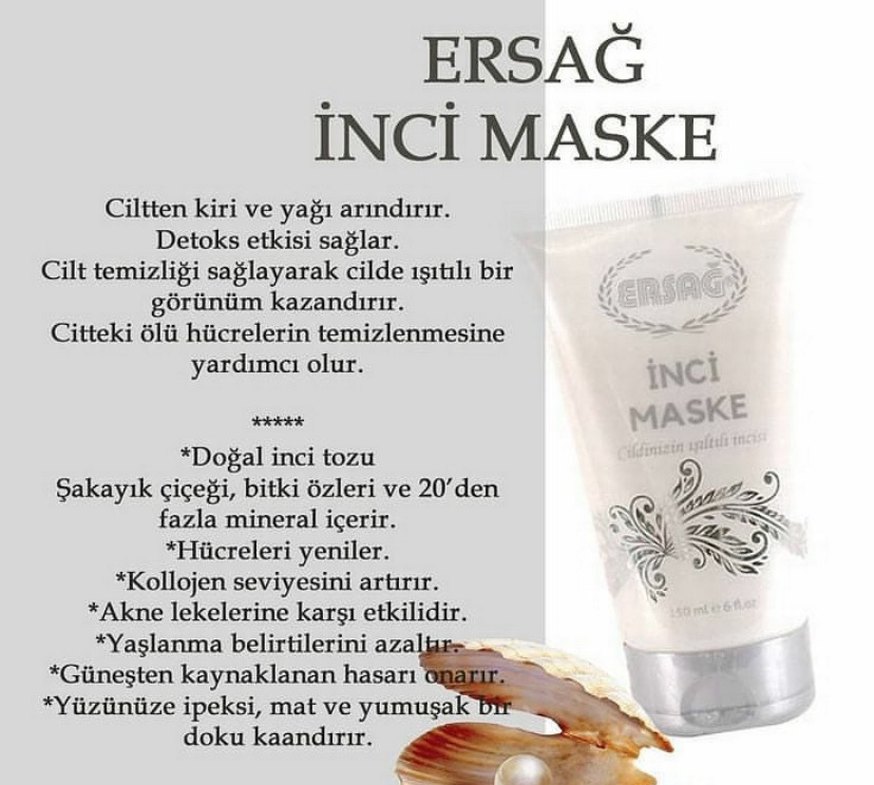 Ersağ İnci Mask doğal inci tozu, çiçek ve bitki özleri ile 20'den fazla mineral içerir. Fazla kiri ve yağı arındırır, detoks etkisi sağlar. Hücreleri yeniler, kolajen seviyesini artırır, lekeleri azaltır ve hasarı onarır. Cilde ipeksi, mat ve yumuşak bir doku kazandırır. *(Ürün fiyatlarında indirim sağlayabilirim. Toplu alımlarda kampanya yaparım. İstediğiniz ürünü getirebilir veya toplu alım için ürünleri birleştirebilirim doktorumuza danışıp rahatsızlığınıza iyi gelen ürünü bulabilirim)* #ersag #ersag #saçbakımkremi #bitkisel #temiziçerik #kampanya #spirulina #kolajen #ersagtürkmalı #cvitamini #magnezyum #agrıkesici #bakım #krem #kollajen #serum #bakımyağı #wcbanyo #geneltemizlik #kireçönleyici