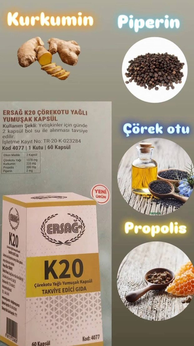 Ersağ K20 yumuşak kapsüller çörek otu yağı ve propolis içerir. Yetişkinler için günde 2 kapsül su ile alınması tavsiye edilir. Kutu içinde 60 kapsül bulunur.