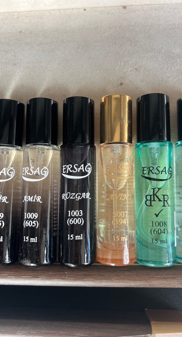 ERSAĞ markasına ait, farklı kokularda 15 ml kadın parfümlerinden oluşan set. Her biri farklı renkli şişede sunulmaktadır.