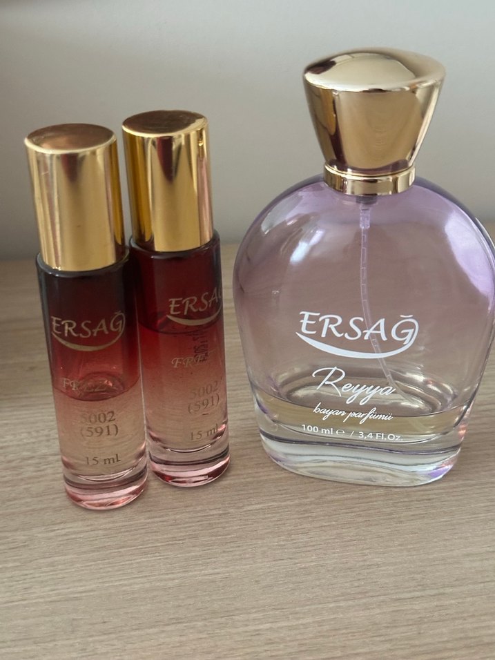 ERSAĞ kadın parfüm seti, 100 ml şişe ve iki adet 15 ml parfüm içerir. İkisi de çok kalıcı kokulardır, denemek için alabilirsiniz.