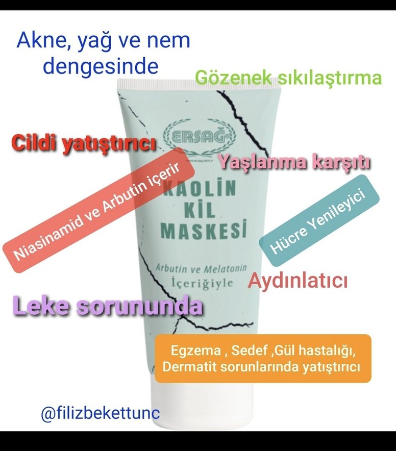 ERSAĞ Kaolin Kil Maskesi, arbutin ve melatonin içerir. Gözenekleri sıkılaştırır, yağ ve nem dengesini sağlar, dermatit sorunlarını yatıştırır, hücre yenilenmesini destekler. Aydınlatıcı ve yaşlanma karşıtı etkisi vardır. Egzama, sedef ve gül hastalığında kullanılır.