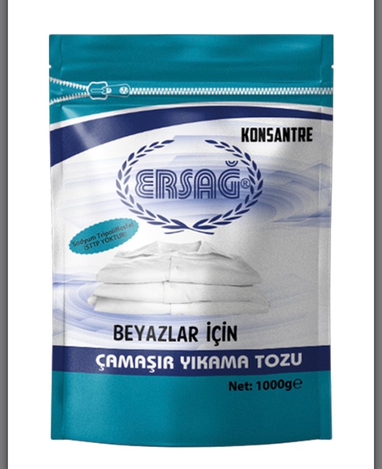 Ersağ markasına ait 1000 gramlık konsantre beyazlar için çamaşır yıkama tozu, beyaz kıyafetlerin temizliği ve parlaklığı için uygundur.