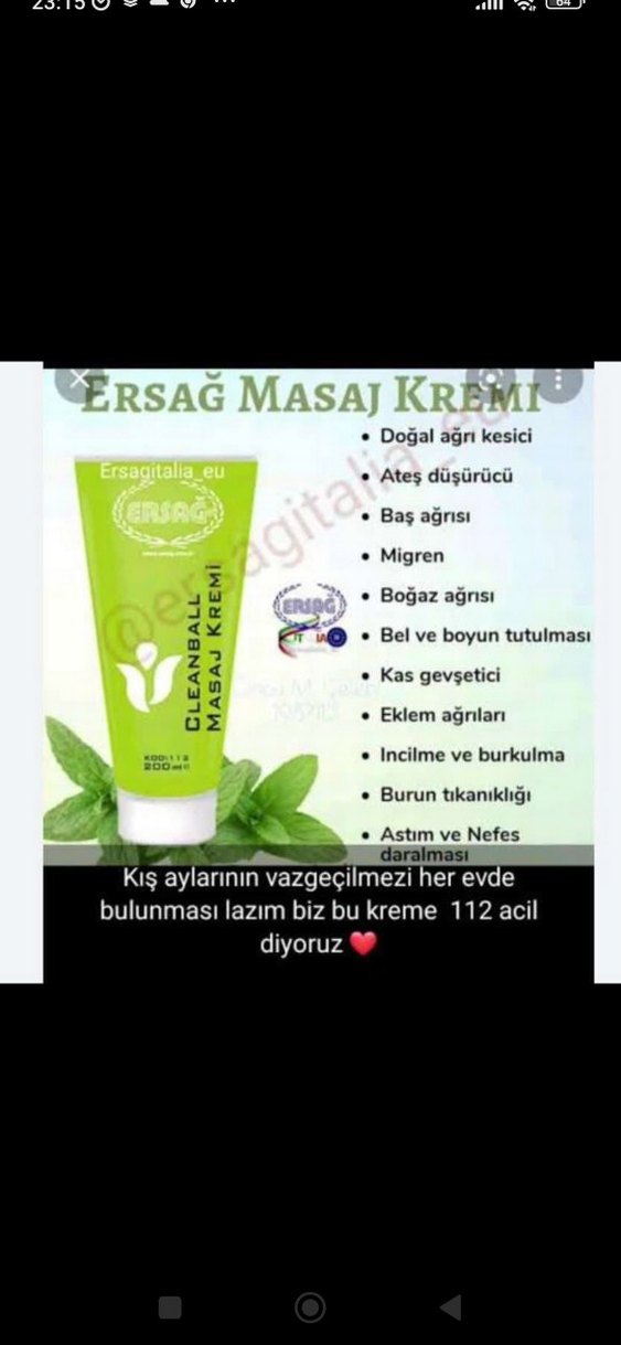 Ersağ masaj kremi doğal ağrı kesici, ateş düşürücü ve baş ağrısı, migren, kas gevşetici etkileriyle öne çıkar. Eklem ağrıları, burkulma, burun tıkanıklığı, astım ve nefes darlığına yardımcı olur.