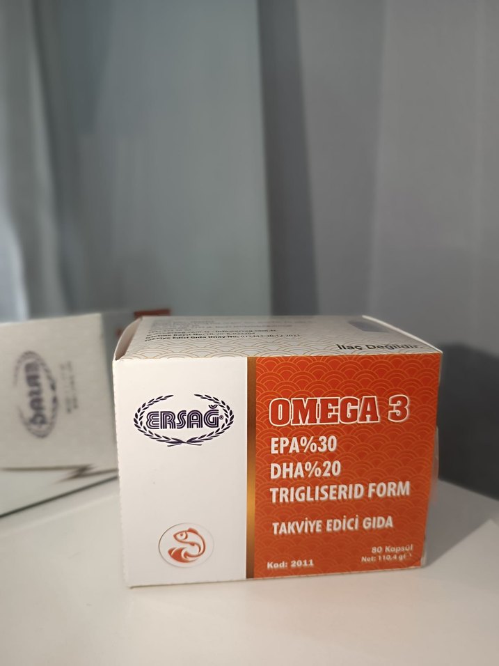 Ersağ Omega 3 takviye edici gıda, %30 EPA ve %20 DHA trigliserid formunda içerir, 80 kapsüllük kutudadır.