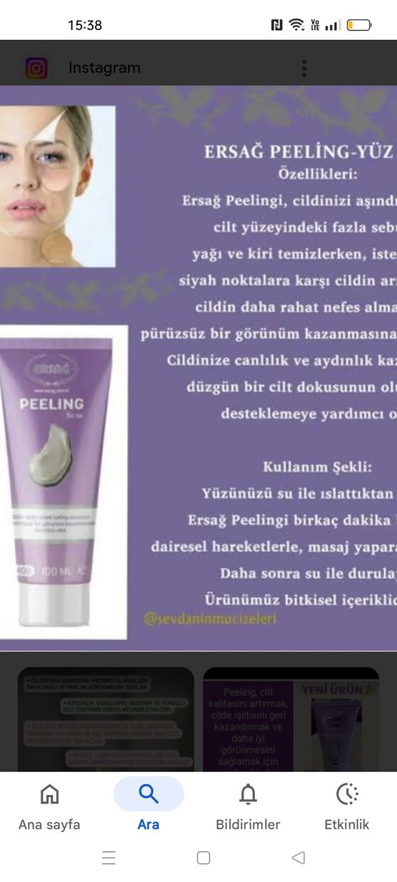 Ersag Peeling, cilt yüzeyindeki fazla sebum ve kiri temizlerken siyah noktalara karşı cildin arınmasına yardımcı olur. Bitkisel içerikli formülüyle cilde canlılık ve aydınlık kazandırır. Yüzü ıslattıktan sonra dairesel hareketlerle masaj yapıp su ile durulayınız.