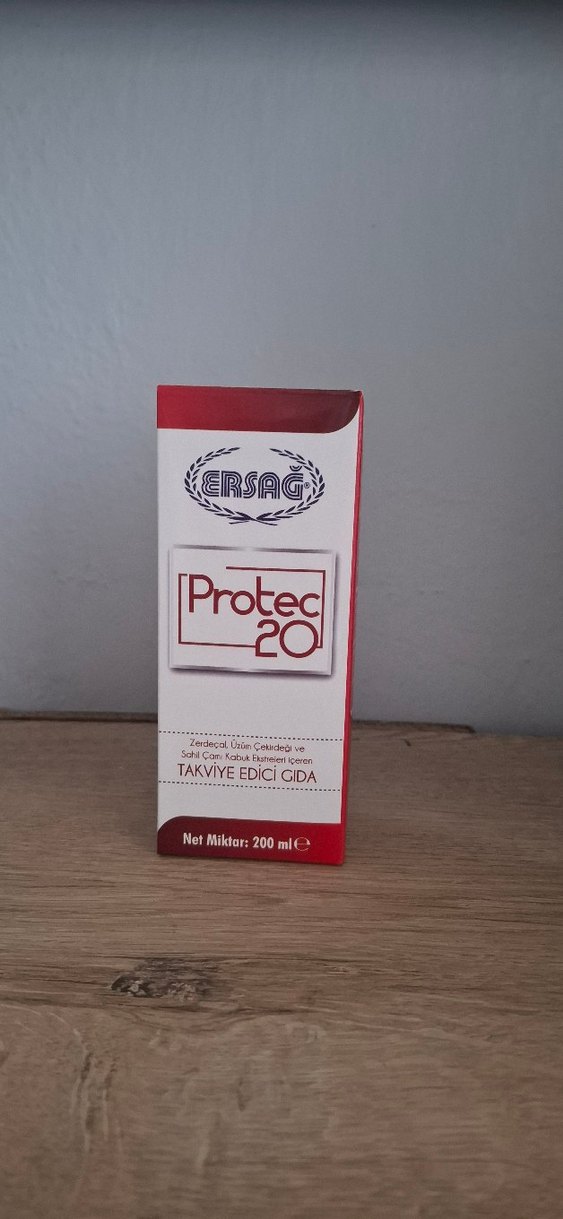 ERSAG Protec 20, bağışıklık sağlığını destekleyen 200 ml takviye edici gıda kutusudur. Beyaz ve kırmızı renklidir. ️