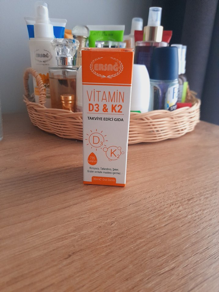 Parlak turuncu kutuda Ersag Vitamin D3 ve K2 takviye edici gıda. Kemik ve bağışıklık sağlığını destekler.