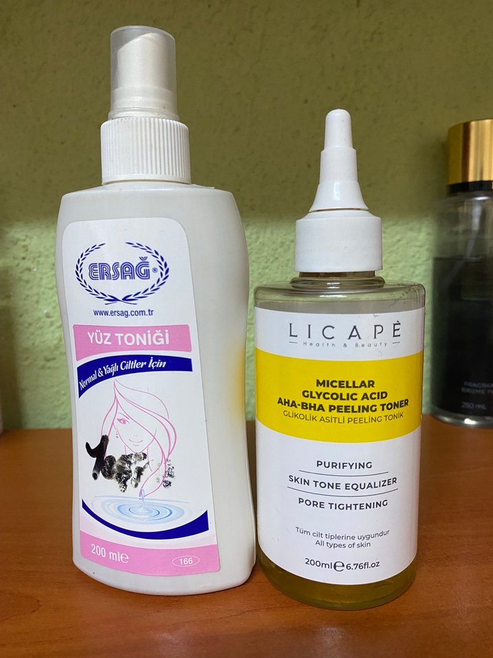 Ersag yüz toniği hassas ve sağlıklı ciltler için, Licape peeling tonik ise glikolik asit içerir, cildi arındırır, ton eşitler ve gözenekleri sıkılaştırır. Tüm cilt tipleri için uygundur.