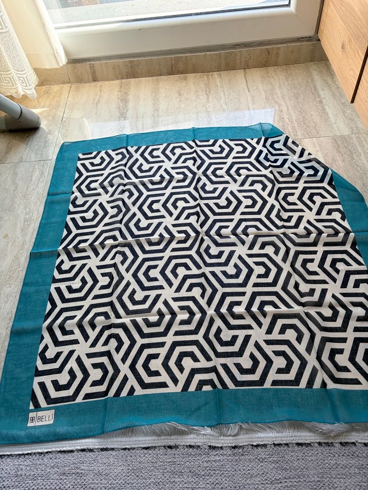 Sentetik kumaş Kadın şalında koyu mavi kenar ve geometrik desen bulunur, yumuşak sentetik kumaştan olup rahatça drape edilir.
