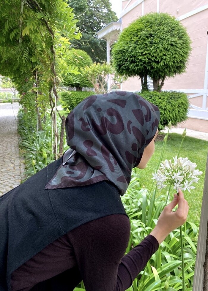 Özel tasarım zemin yeşil desen siyah twill eşarp