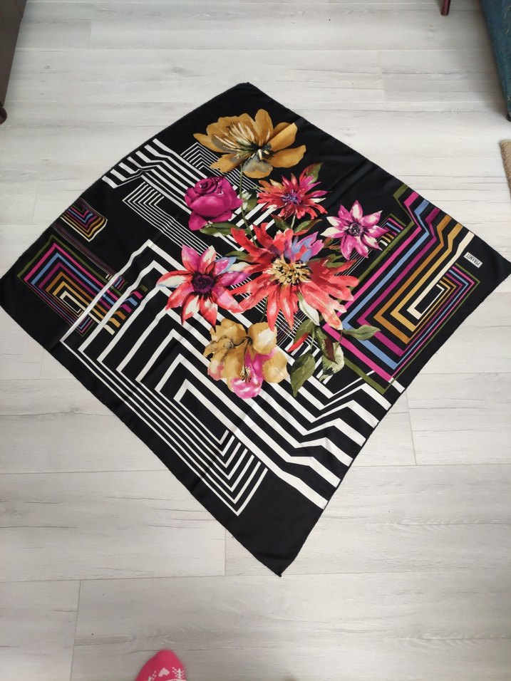 koyu zeminde çok renkli çiçekli ve geometrik desenli eşarp