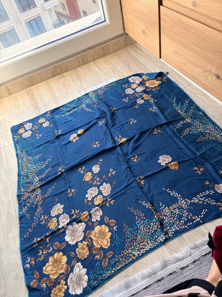 Büyük boy eşarp Sentetik kumaştan, bohem tarzda, koyu mavi renkli, çiçek desenli ve drapeli kadın şalı.