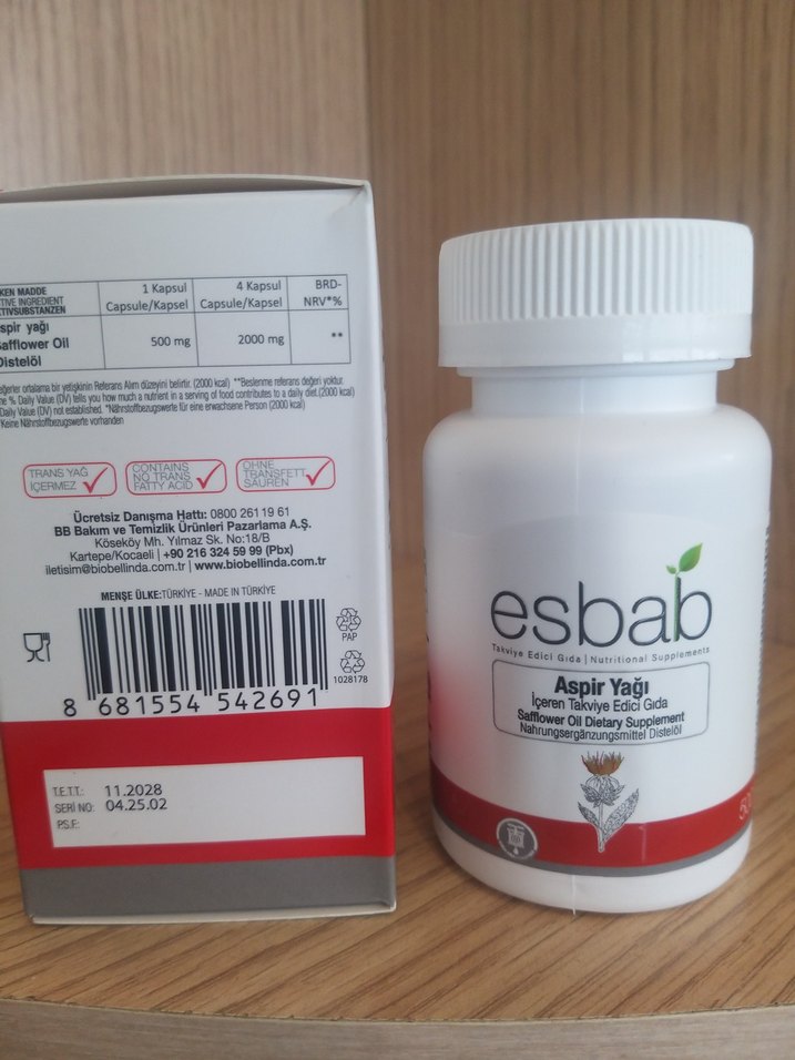 Esbab Aspir Yağı kapsülleri, her kapsülde 500 mg aspir yağı içerir. 60 kapsül içeren takviye edici gıda ürünüdür.