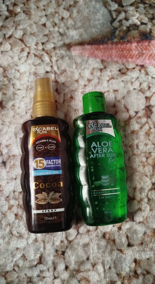 Escabel'in 15 faktör korumalı kakao özlü bronzlaştırıcı yağı ve aloe vera içeren after sun jeli vitamin E ile cildi korur ve rahatlatır. Her biri 70 ml.